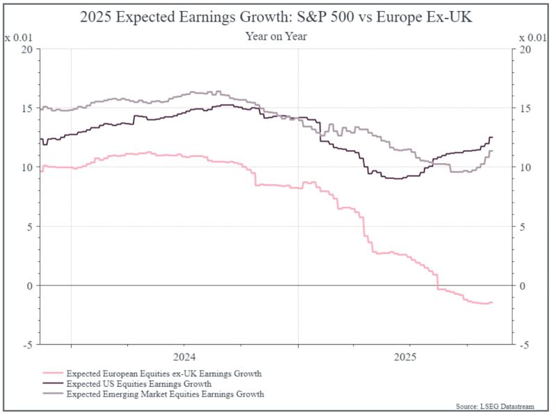Vale anche la pena ricordare che questa performance è arrivata in un periodo in cui le aspettative sugli utili in Europa sono rallentate in modo marcato. Il grafico qui sotto mostra come le attese di crescita degli utili per il 2025 siano cambiate nel tempo.