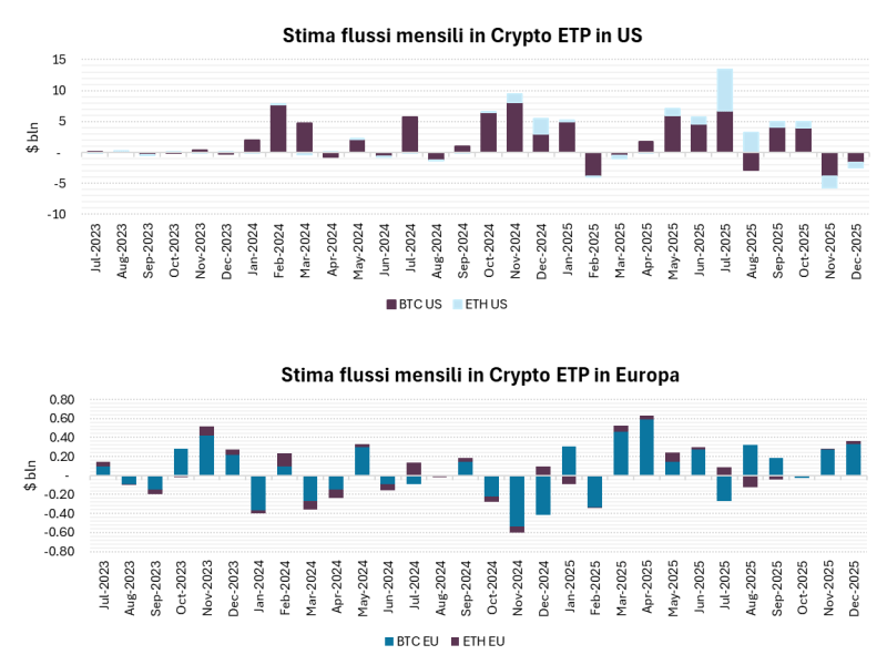 Al contrario, il mercato europeo degli ETP ha mostrato una certa resilienza. Pur non registrando un afflusso significativo di nuovi capitali, l’Europa è riuscita a evitare i deflussi netti prolungati osservati negli Stati Uniti. È tuttavia importante sottolineare che, nonostante questa tenuta, i volumi assoluti dei flussi verso l’Europa restano marginali se confrontati con la scala e la liquidità complessiva del mercato globale degli ETP. Di conseguenza, pur offrendo un contrappeso psicologico, il contributo europeo non è sufficiente a compensare i movimenti negativi più ampi registrati altrove.