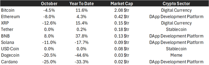 Tuttavia, questo ottimismo si è bruscamente invertito il 10 ottobre. L’evento che ha definito il mese è stato un violento crollo improvviso di natura macroeconomica, scatenato dall’annuncio del presidente Trump sullo “shock dei dazi”. Il presidente ha infatti dichiarato l’introduzione di tariffe del 100% sulle importazioni di software critici dalla Cina, a partire dal 1 novembre, accompagnate da nuove restrizioni all’esportazione.