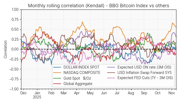 La correlazione con i principali fattori macroeconomici resta debole. Il legame di Bitcoin con asset tradizionali come l’oro o con la politica monetaria statunitense non risulta significativo. Il calo del Bitcoin è cominciato a inizio ottobre, quando la narrativa sulla politica monetaria era ancora “dovish” (accomodante), ed è proseguito anche quando il tono si è fatto più restrittivo verso fine mese, dopo il cambio di direzione della Federal Reserve (Fed).