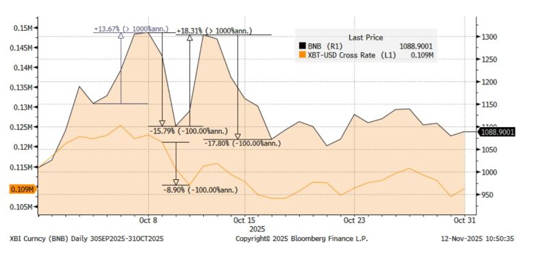 Binance Coin (BNB) ha registrato una performance positiva, ma con una volatilità estrema, caratterizzata da una rapida successione di rialzi e ribassi di circa il ±15%, superando di gran lunga i livelli di volatilità tipici del mercato crypto. La settimana dell’annuncio è stata difficile per l’intera asset class, con il Bitcoin che ha perso quasi il 9%. Tuttavia, come mostrato nel grafico sottostante, ha poi evidenziato una maggiore stabilità nei giorni successivi.