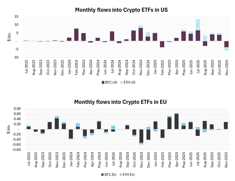 In Europa il quadro è stato più resiliente: gli ETF su Bitcoin hanno registrato flussi in ingresso a novembre, dopo un ottobre più debole. Questo segnala tra gli investitori europei un atteggiamento da “buy the dip”.