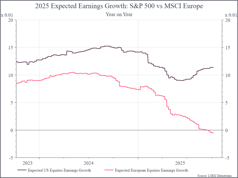 Negli ultimi mesi le aspettative sugli utili europei, invece, sono diminuite sensibilmente: gli analisti ora prevedono una crescita nulla per le azioni europee nel 2025.