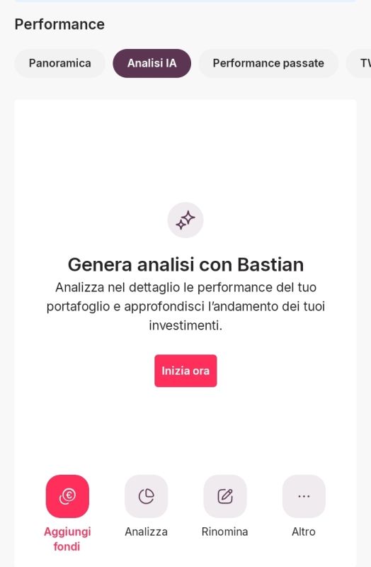 Bastian crea in pochi secondi un’analisi completa del portafoglio, disponibile direttamente dall’applicazione. È sufficiente accedere al dettaglio del portafoglio dalla dashboard e selezionare “Analisi IA” per visualizzare l’aggiornamento.
