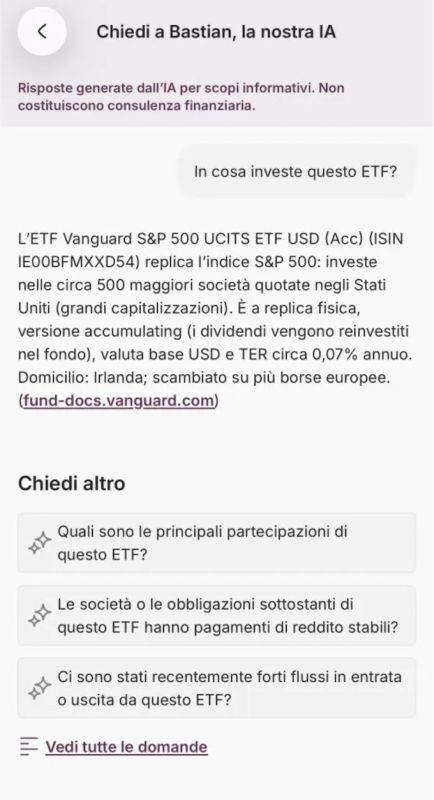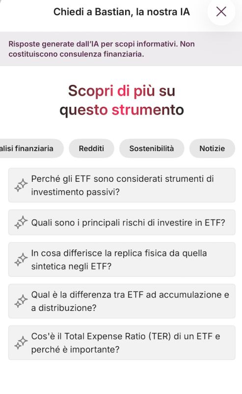 Le informazioni fornite da Bastian sono generate automaticamente da un sistema IA e hanno natura puramente informativa. Non costituiscono consulenza finanziaria personalizzata né raccomandazione di investimento. Come ogni sistema IA, Bastian può presentare limitazioni o imprecisioni: per decisioni significative ti invitiamo a confrontarti con un consulente Moneyfarm.
