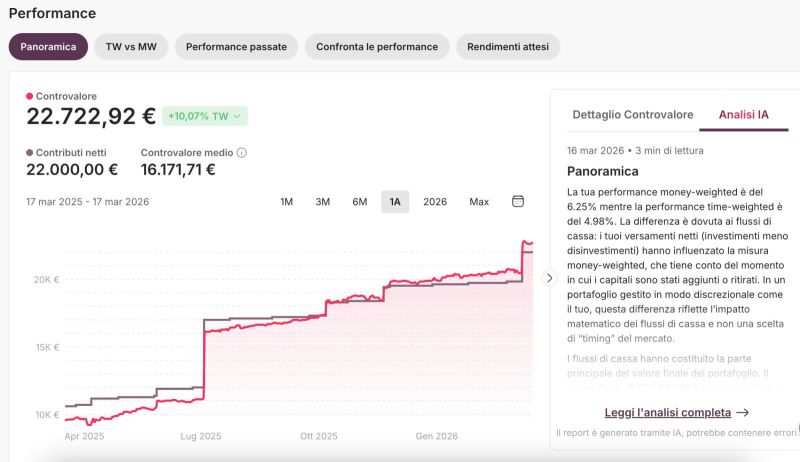 Il report IA è uno strumento di supporto informativo. Non sostituisce il servizio di consulenza personalizzata di Moneyfarm e non valuta l’adeguatezza degli investimenti al tuo profilo.