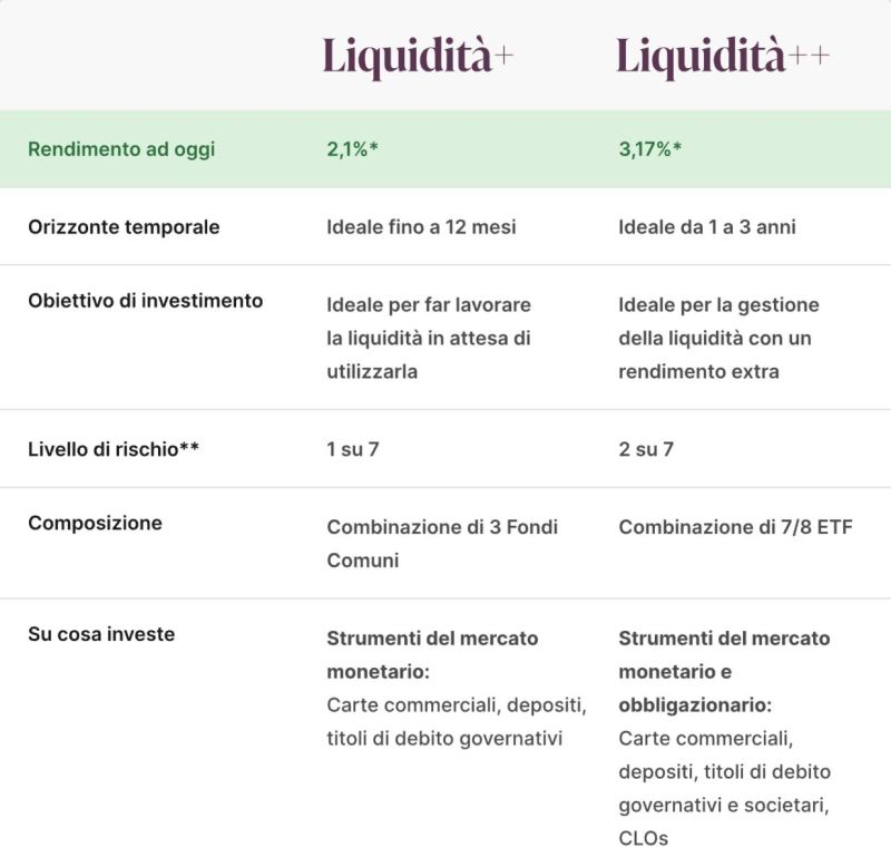 Liquidità++ è pensato per chi ha un orizzonte temporale indicativo tra 1 e 3 anni, vuole parcheggiare la liquidità in modo più efficiente, cerca una soluzione intermedia tra conto deposito e portafogli obbligazionari più esposti.